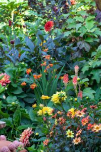 • Další vhodnou rostlinou do polostínu je montbrécie (Crocosmia). Její ohnivě červené, oranžové nebo žluté květy přitahují motýly a jsou barevným oživením mezi rostlinami, jako jsou kapradiny nebo bohyšky.
